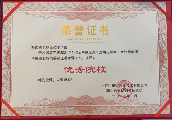 近日,我校汽车工程学院收到“1+X”汽车专业领域职业技能等级证书评价组织—北京中车行高新技术有限公司发来的荣誉证书,祝贺我校圆满完成2021年1+X证书制度汽车运用与维修、智能新能源汽车职业技能等级证书考评工作,成绩优异,被评为“优秀院校”。