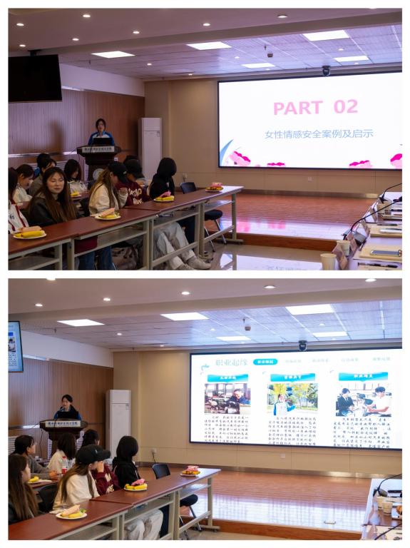 学生分享环节,24新能源1班的惠欣怡同学聚焦职业规划,从“目标-行动-定位”三个维度展开分享:她明确了大学期间的学业目标,计划通过深耕专业知识、参与竞赛、考取技能证书来夯实能力基础,希望能在新能源汽车营销领域找准定位,用专业能力为行业发展贡献力量。24新能源3班的刘文璇同学则围绕“女性安全”这一贴近生活的主题,结合真实案例与实用技巧展开讲解:她不仅细致梳理了日常出行、校园生活中的安全防范要点,还特别强调要警惕陌生人搭讪、妥善保护个人信息隐私,增强了大家的自我保护意识。