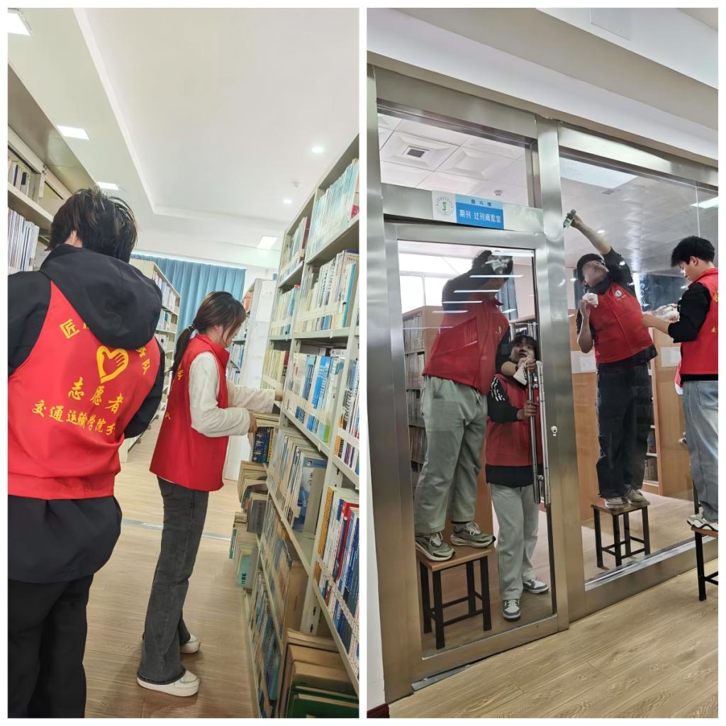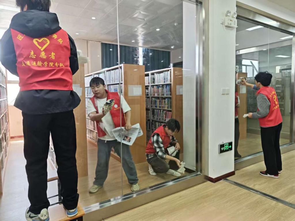 活动现场,志愿者们不怕脏、不怕累,充分展现了新时代大学生的实干与奉献精神。有的弯腰清扫图书馆地面的纸屑、杂物,不放过任何一个卫生死角;有的踮起脚尖,细致擦拭书架、阅览桌和门窗,拂去积尘,让每一处设施都焕然一新;还有的志愿者小心翼翼地整理散落的书籍,将其归位整齐,助力营造有序的阅读环境。20名志愿者相互配合、默契协作,忙碌的身影穿梭在图书馆的各个角落,成为春日校园里一道温暖亮丽的风景线。
