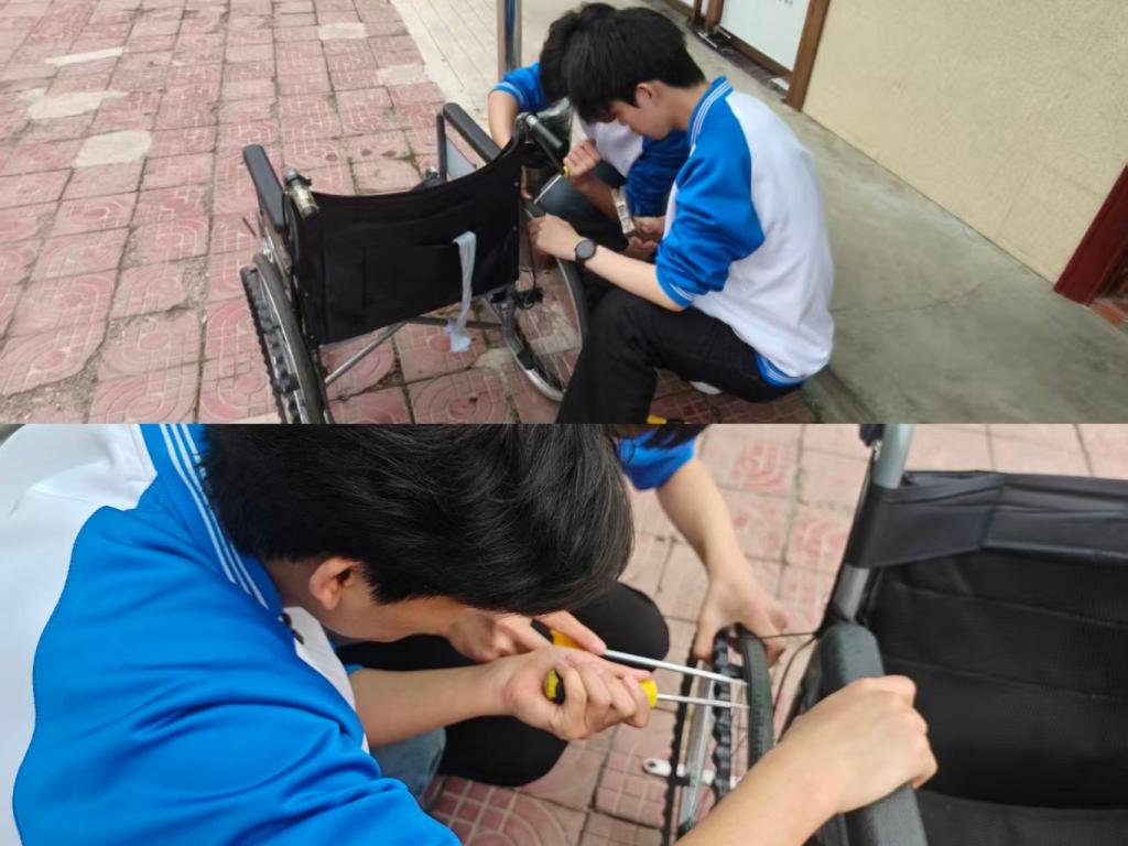 考虑到老人们日常出行的需求,志愿者们主动承担起轮椅等辅具的维护工作。同学们仔细检查轮椅的轮胎、刹车、链条等关键部件,针对松动、磨损的零件进行调试维修,使用工具紧固螺丝、更换损坏部件,确保轮椅运转正常、使用安全。细致的维修工作,为老人们的日常出行筑牢安全防线,让老人能够放心使用辅具,也展现了志愿者们的专业与用心。